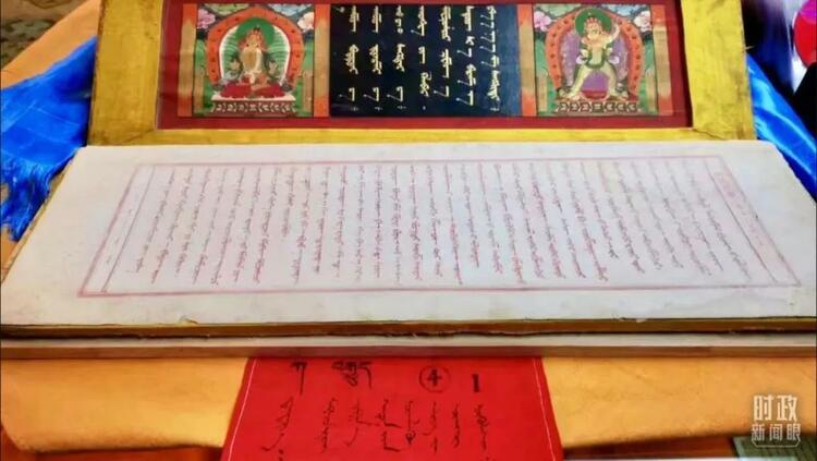 △《甘珠爾經》是研究佛學、哲學、語言、民族文化交流等方面的重要文獻,被稱為蒙古文的百科全書。目前內蒙古大學圖書館珍藏的版本,是世界上最完整的版本。(總臺央視記者張曉鵬拍攝)