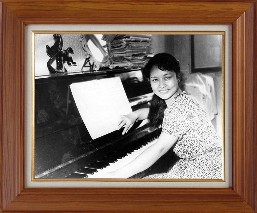 一張是彭麗媛年輕時(shí)坐在鋼琴前的單人照。