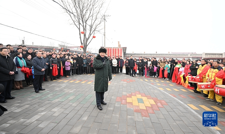 1月26日至27日,中共中央總書記、國家主席、中央軍委主席習近平來到山西,看望慰問基層干部群眾。這是26日下午,習近平在臨汾市汾西縣僧念鎮段村文化廣場,給鄉親們拜年,向全國各族人民、向港澳臺同胞和海外僑胞致以美好的新春祝福。新華社記者 李學仁 攝