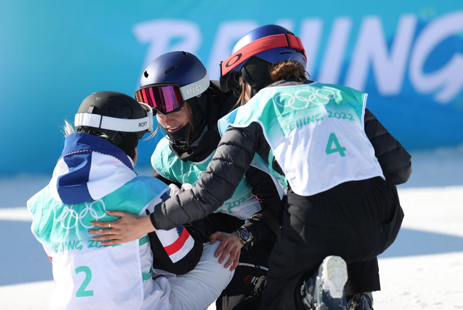 2月8日,中國選手谷愛凌(右)和瑞士選手瑪蒂爾德·格雷莫德(中)在比賽后安慰法國選手泰絲·勒德。當日,北京2022年冬奧會自由式滑雪女子大跳臺決賽在北京首鋼滑雪大跳臺舉行。新華社記者 丁旭攝