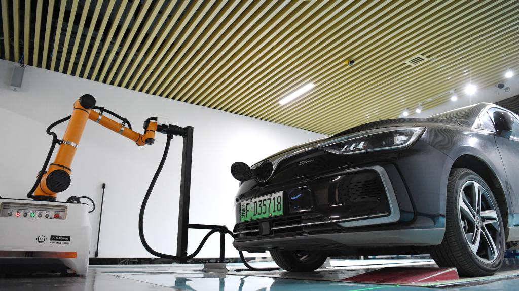 在劇村站智慧充電區,插拔槍機器人對一輛電動汽車進行充電。(新華社記者朱旭東攝)