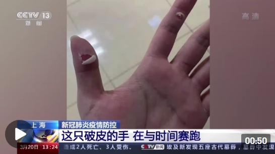 上海本輪疫情發(fā)生后,核酸檢測(cè)采樣、檢測(cè)工作量激增,核酸采樣和檢測(cè)人員堅(jiān)守崗位分秒不停。這兩天在社交媒體上,一張醫(yī)務(wù)人員破皮的手的照片讓大家動(dòng)容。