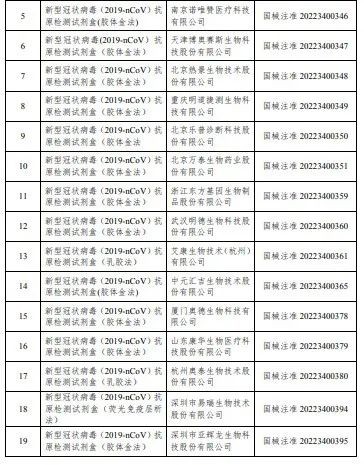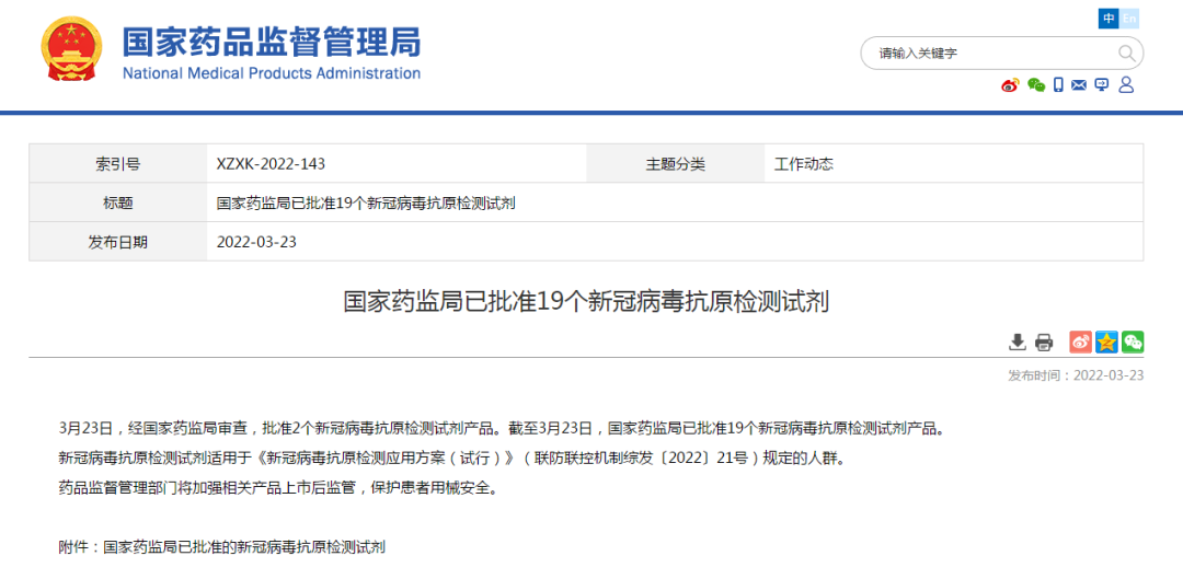 國家藥監局已批準19個新冠病毒抗原檢測試劑