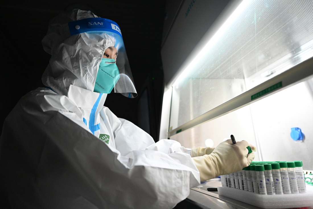 3月29日,在河北省遵化市人民醫(yī)院,穿戴防護(hù)服的核酸檢測員雷蕾在樣品處理區(qū)工作。新華社發(fā)(劉滿倉攝)