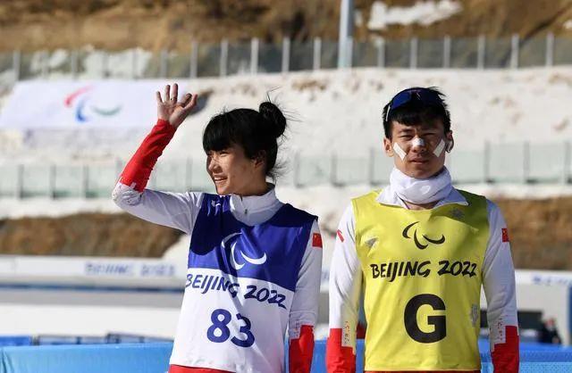 △3月8日,在殘奧冬季兩項女子中距離(視障)比賽后,王躍(左)向現場觀眾致意。