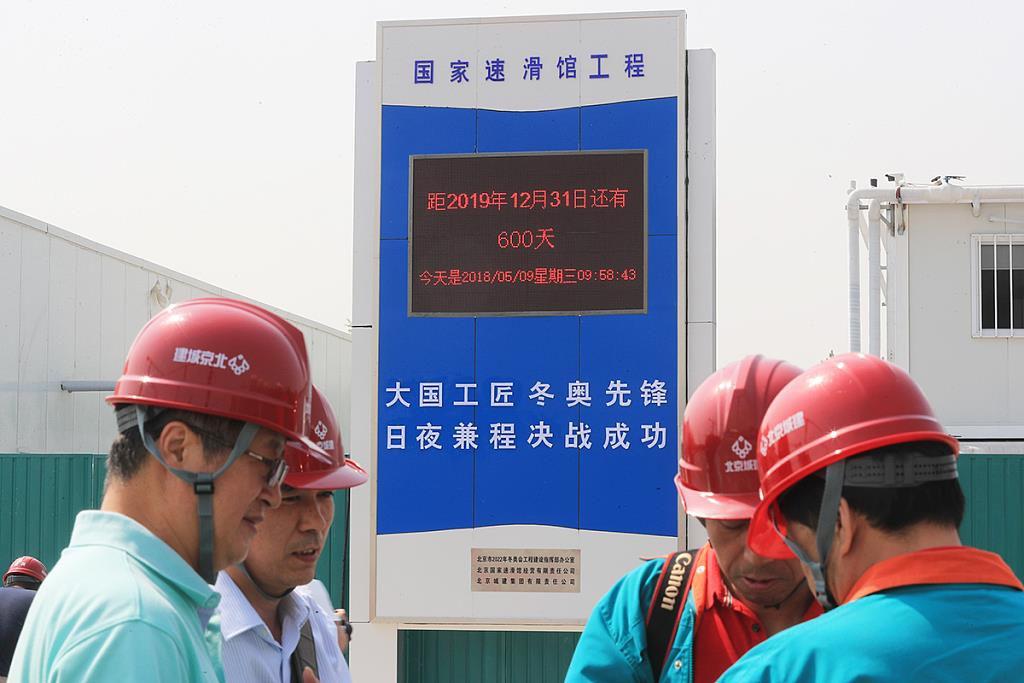 △2018年5月9日,北京,冬奧建設項目國家速滑館現場倒計時牌啟用。