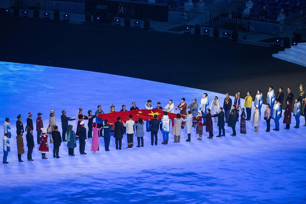 △2月4日,2022北京冬奧會開幕式在國家體育場舉行。鳥巢中央,一面五星紅旗在12位小朋友手中徐徐展開。隨后,他們將國旗傳遞給176名代表。