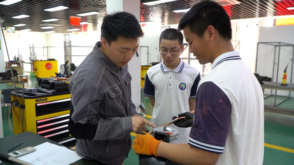 4月12日,在安吉技師學院的教學車間里,楊應政(左一)正在手把手教授學生如何做好規定角度的鋼管煨彎工藝。新華社記者李濤 攝