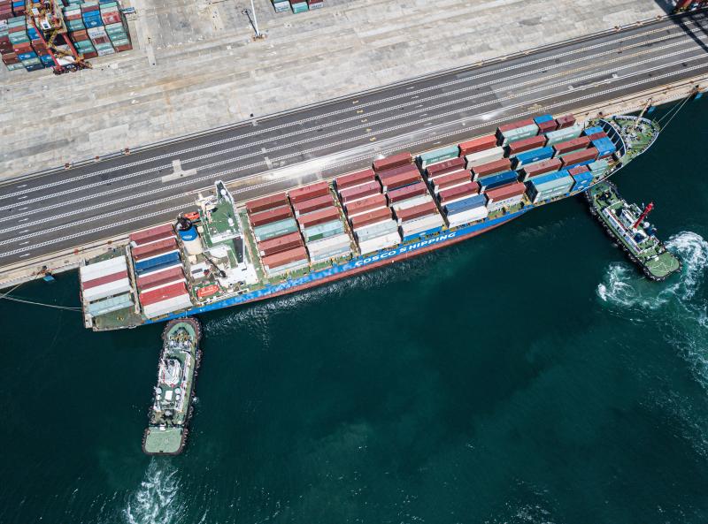 2020年9月23日,引航員指揮兩艘拖輪輔助一艘集裝箱船靠泊在洋浦港小鏟灘碼頭(無人機照片)。 新華社記者 蒲曉旭 攝