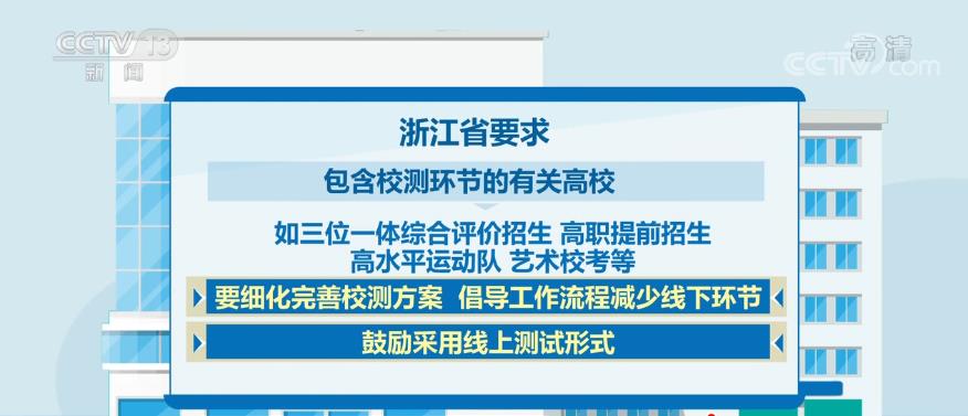 浙江省要求各地各校提前制定突發(fā)疫情應(yīng)急預(yù)案,做到“一類一方案”“一生一方案”。按要求為每個(gè)考點(diǎn)配備防疫副主考,設(shè)置具備防護(hù)隔離措施的特殊通道和專用隔離考場(chǎng)。包含校測(cè)環(huán)節(jié)的有關(guān)高校,如三位一體綜合評(píng)價(jià)招生、高職提前招生、高水平運(yùn)動(dòng)隊(duì)、藝術(shù)校考等,要細(xì)化完善校測(cè)方案,倡導(dǎo)工作流程減少線下環(huán)節(jié),鼓勵(lì)采用線上測(cè)試形式。