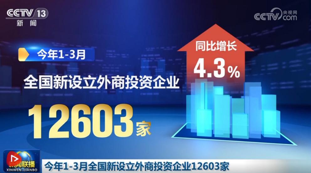 央視網消息(新聞聯播):商務部最新數據顯示,今年1—3月,全國新設立外商投資企業12603家,同比增長4.3%;實際使用外資金額2692.3億元人民幣。