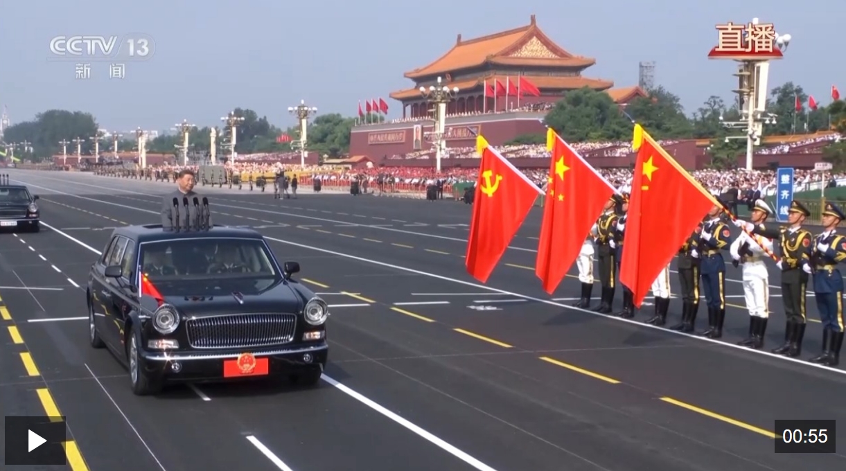 偉大旗幟光耀千秋。中國共產(chǎn)黨黨旗、中華人民共和國國旗、中國人民解放軍軍旗在受閱部隊最前方迎風(fēng)招展。檢閱車行進(jìn)至黨旗、國旗、軍旗前,敬禮號角響起,習(xí)近平停車肅立,以注目禮向三面旗幟莊嚴(yán)致敬。