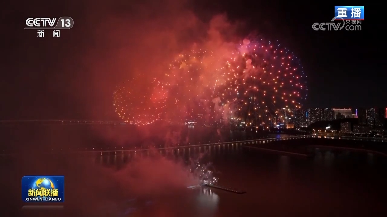 10月1日,香港在維多利亞港舉行國(guó)慶煙花匯演,超過(guò)3萬(wàn)枚煙花照亮夜空。匯演中還特別融入了東江水、大熊貓和全運(yùn)會(huì)等元素,吸引眾多市民和游客前來(lái)觀看。在澳門,伴隨《七子之歌》等歌曲,不同造型的煙花在夜空中綻放,表達(dá)對(duì)祖國(guó)的美好祝福。當(dāng)晚還舉行了“火樹銀花嘉年華”,為觀眾提供更多觀賞樂(lè)趣。