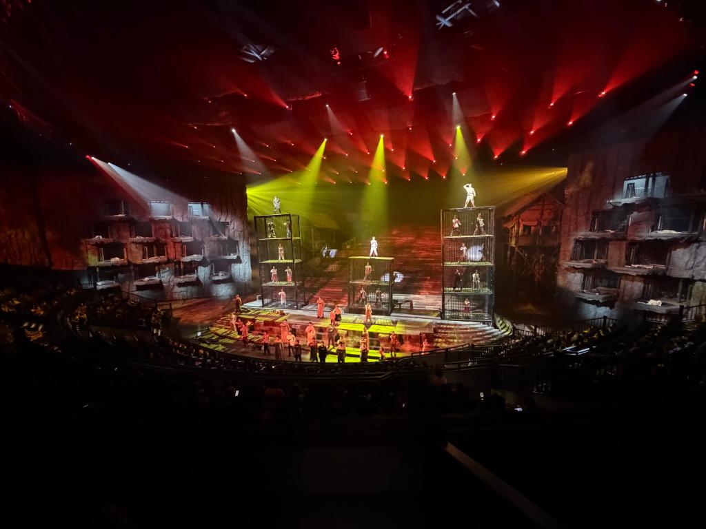 上一秒還是重慶熙攘的街頭巷陌,隨著舞臺和觀眾席的緩緩旋轉,場景無縫切換至渣滓洞監獄。“槍聲”從耳畔掠過,座椅隨“炮聲”震顫,燈光模擬出天邊破曉和熊熊火光……觀眾仿佛被拉回到1949年的山城。