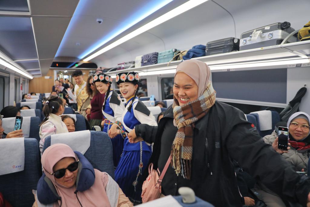 11月22日,在麗香鐵路動(dòng)車組列車上,東南亞游客與身著民族服飾的乘務(wù)員一同跳舞。新華社發(fā)(楊紫軒攝)