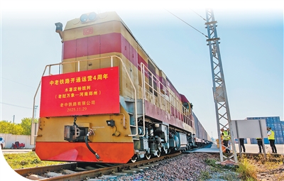11月29日,一列滿載1000噸木薯淀粉的鐵路集裝箱班列從中老鐵路萬象南站駛出,準(zhǔn)備發(fā)往河南鄭州。這是老撾首次成列運(yùn)輸輸華的木薯淀粉。
