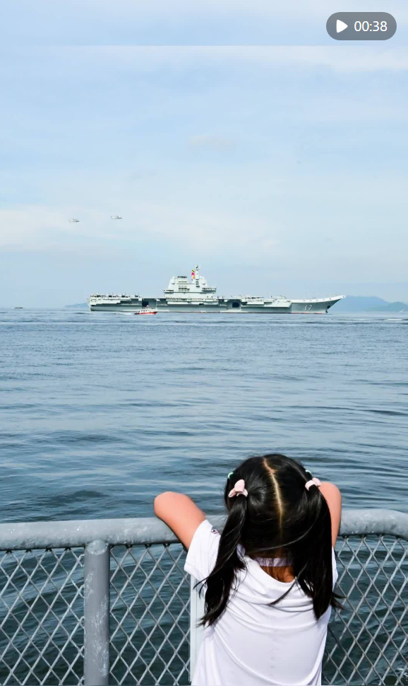 7月3日,中國海軍山東艦航母編隊抵達(dá)香港,一名兒童在岸上觀看海軍山東艦。