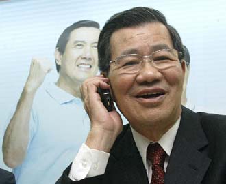 國(guó)民黨副參選人蕭萬(wàn)長(zhǎng)昨天舉行“美加微笑之旅”行前記者會(huì),會(huì)后馬英九特別打電話向其致意。臺(tái)灣《聯(lián)合報(bào)》記者潘俊宏攝
