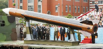 臺軍方10日首次展示秘密研發的“天弓”三型導彈。(臺灣《聯合晚報》圖片)