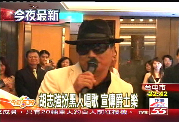 胡志強昨晚在記者會上戴上黑墨鏡、穿白西裝、戴白禮帽,臉上涂黑,還特別畫上黑人特有的厚唇,一入場就模仿黑人爵士歌手劉易斯,以略帶沙啞的渾厚嗓音唱“What a Wonderful World”,現(xiàn)場鎂光燈閃個不停。