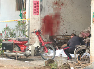 臺灣屏東縣恒春鎮昨天下午發生爆炸案,趙進玉在敲打撿回的炮彈時被炸死。墻上噴濺的血漬,令人觸目驚心,現場一片狼藉!。ㄅ_灣《聯合報》圖片)