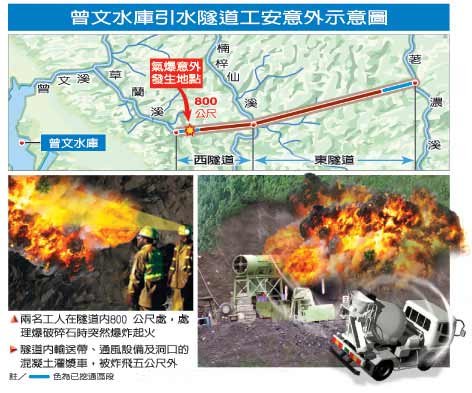 發生氣爆的隧道已開挖約1000米,須由嘉義大埔鄉前往,嘉義縣消防局據報后立即動員大批消防人車,昨天下午第一批搜救人員摸黑進入隧道內約400米處,發現空氣中有一半是有毒和危險氣體,趕緊撤出。(高大林)