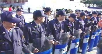 三百多名鎮暴警察拿著盾牌圍成人墻,一步步往“大中至正”牌樓外走,希望驅離還在牌樓內的民眾。(臺灣TVBS圖)