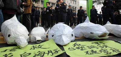 臺灣環保團體9日帶著紙糊的白海豚,在臺當局“行政院”大門外抗議陳情,呼吁擬定白海豚保護計劃及行動綱領。臺灣“中央社”記者王飛華攝
