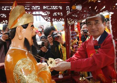 福建閩王王審知的金身,9日在后裔護駕下“小三通”到金門巡安,為1000多年來的創舉,臺灣“立法院長”王金平(右)以裔孫身分敬獻金牌迎駕。臺灣“中央社”記者倪國炎攝