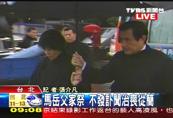 據報道,馬英九的岳父日前過世,今天舉辦公祭,馬家人一大早就出門前往殯儀館。在家祭的最后,馬英九跪在老丈人面前,感性地說了一段話,內容大意是說自從和周美青結婚后,讓周美青身為公眾人物的太太,日子過得相當委屈,也感謝老丈人多年來在背后的支持,希望他能原諒他。