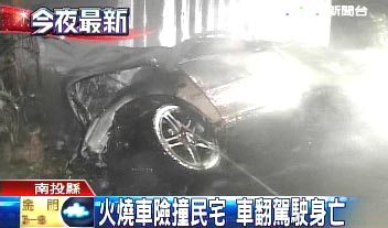 報道稱,晚間6時許,這臺小轎車行經(jīng)中潭公路32公里處突然失控,先翻覆掉落水溝,再滑行沖撞一戶民宅,接著便起火燃燒。目擊者稱:“我就沒看到什么,我就趕快拿水來灌救,只聽到砰一聲,火就很大了!”