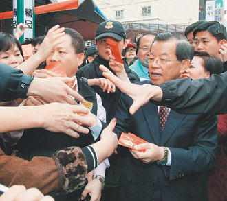 謝長廷昨天到臺中市天津街年貨大街向民眾拜年,并發送新臺幣10元紅包,一小時內發出3000個。(聯合報圖)