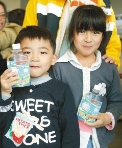 貓纜搭乘破300萬人次,臺北捷運公司現場限量發送一萬瓶Q版貓纜水瓶。(臺灣《聯合報》圖片)