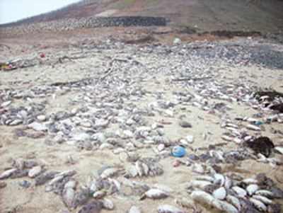 養殖的、海里的 全遭殃——澎湖望安海灘上遍布凍死魚尸,看了讓人怵目驚心。(臺灣《中國時報》圖片)