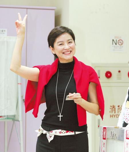 林青霞22日投票后打出“V”的手勢 (臺灣《中國時報》圖片)