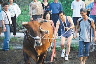 馬英九(前右二)曾在下鄉時向農夫許支主(前右)學犁田,馬希望各“部會首長”以后也要下鄉長住。臺灣《聯合報》資料照片 范凌嘉攝