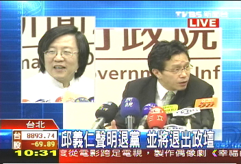 中國臺灣網(wǎng)5月5日消息 據(jù)臺灣TVBS電視臺報道,臺當局“行政院”今天上午召開“院會”,“副院長”邱義仁請假未上班,由“新聞局長”謝志偉代為發(fā)布退出民進黨的聲明。