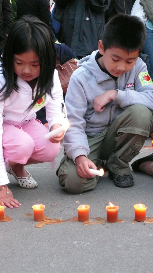 英瑤女士和梅朗雄跟小朋友一起悼念四川大地震遇難者。