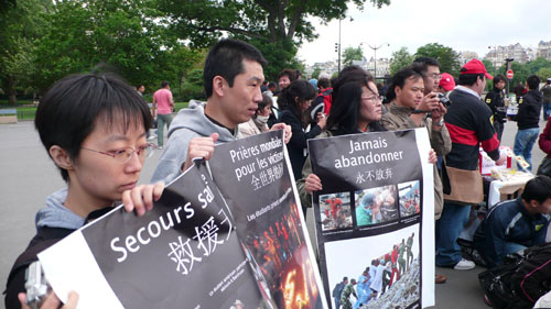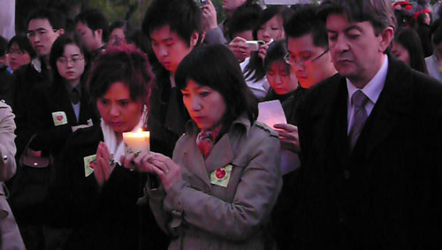 法國友人與法國華人華僑和留學(xué)生一起為四川大地震遇難者進(jìn)行祈禱。圖中為法國前總統(tǒng)希拉克的養(yǎng)
