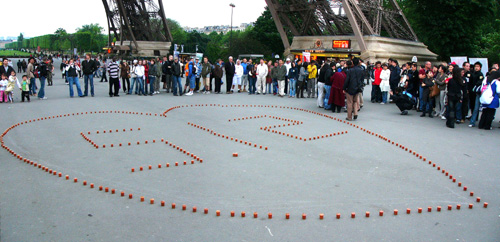埃菲爾鐵塔下擺好的祈福蠟燭圖案。當(dāng)天,法國巴黎舉行了千人參加的燭光祈福活動,向四川大地震受害者表達(dá)哀思。