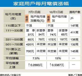 臺灣地區電價漲幅表,來源:臺灣《聯合報》