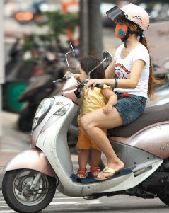 臺灣家長騎著摩托車接送小朋友時,往往會讓小朋友暴露在交通危險中。臺灣《聯合晚報》圖