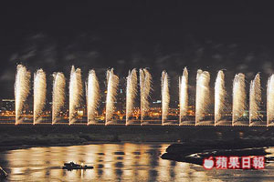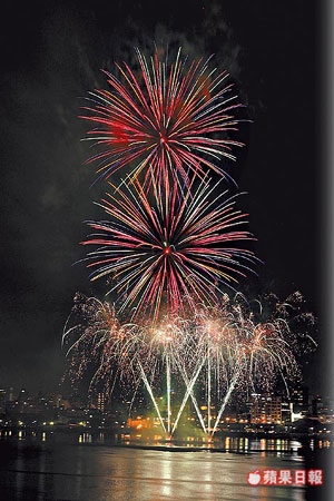 據臺灣媒體報道,昨晚8時30分淡水河畔先以電影《泰坦尼克號》配樂開場,連接臺北縣市的忠孝橋隨即噴出800米煙火瀑布。4艘平臺船接著從河面上發射七彩花朵、愛心、游龍、獅子頭等高空煙火圖案,其中包括號稱歷來最大的10英寸高空煙火,射程可離地300米,開花直徑200米,另搭配多款低空煙火。