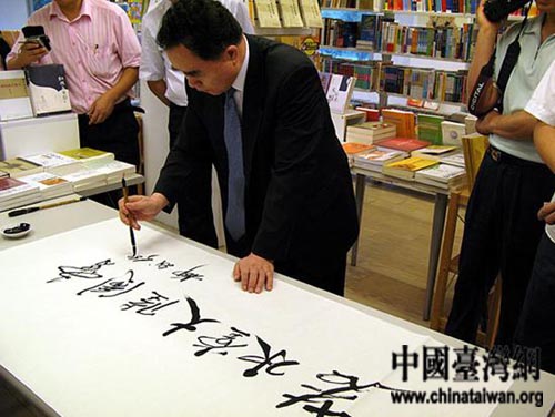 中國臺灣網9月27日消息 紀念海峽兩岸出版交流20年系列活動大陸代表團團長、新聞出版總署署長柳斌杰一行,9月25日上午赴若水堂大陸圖書高雄店參訪,柳斌杰署長親切會見了若水堂董事長宋東文并與之進行座談。宋東文對現階段臺灣地區簡體字圖書進口銷售經營現況進行了簡報。會見后,柳斌杰署長揮毫為若水堂題字:“上善若水”。