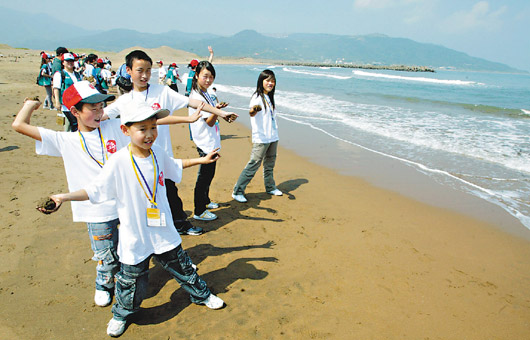 由于臺風剛過,海灘滿布垃圾、漂流木,主辦單位為避免從未看過海的小朋友失望,特別讓他們走到海邊,但是不可以脫鞋。小朋友們彎腰玩水,也有人堆起沙堆或是抓起海沙猛力丟向大海。潮水涌上時,人人急著往回奔,來不及的人鞋子打濕,但依然玩得很高興。在四川地震中救出多名同學的高一生王祖全還用寶特瓶裝了半瓶海沙,他說,家鄉不靠海,要把海沙帶回家當紀念。