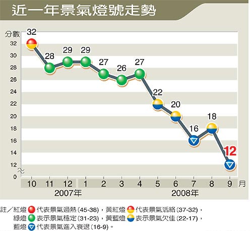 臺經濟建設部門的景氣燈號分數由9分起跳,9月分數跌到12分,臺經濟建設部門官員不諱言,觀察目前狀況,下個月分數恐將繼續下探。
