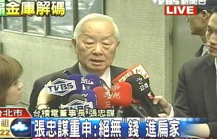 張忠謀表示,他在上個月的聲明中已經說得很清楚,他與臺積電沒有任何理由、也沒有送錢給陳水扁或吳淑珍,過去在選舉時曾捐款給民進黨及國民黨,都有收據可查。