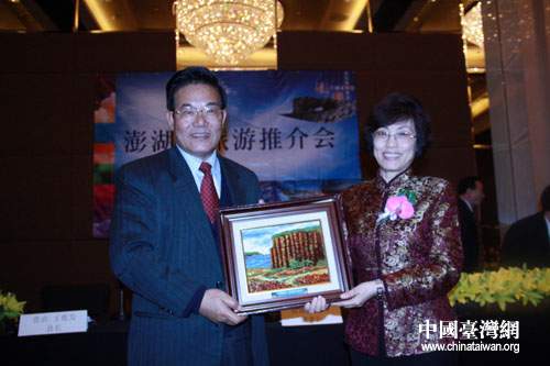 澎湖縣長王乾發(fā)和北京市旅游業(yè)界代表、北京市旅游局巡視員熊玉梅互贈禮物。(中國臺灣網(wǎng) 鐘寶華 攝)