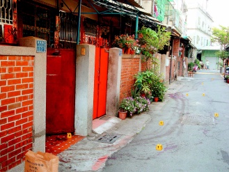 臺灣海軍士兵曾紹慈、梁伯羽殺死越南女子,被害人死前掙扎逃出,倒在屋外二十公尺處,卻被兇嫌拖回去繼續砍,地上留有長長血痕,警方沿著血痕擺放搜證的號碼牌。(圖片來源:臺灣《聯合報》)