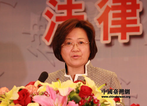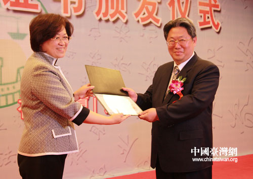 國家司法考試司司長丁露為獲得律師職業資格的臺灣居民頒發資格證書。(中國臺灣網 張弛 攝)